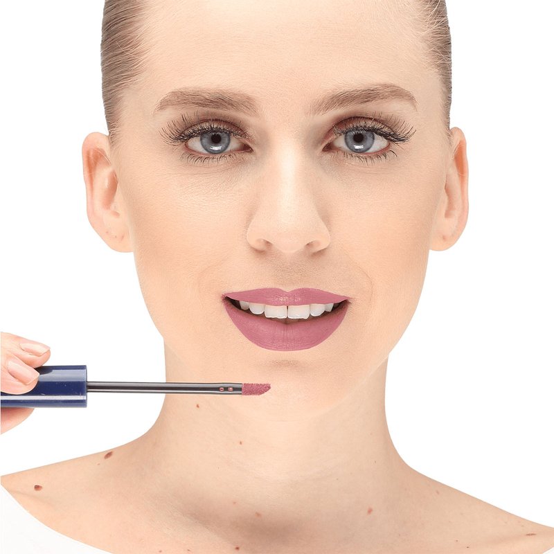 Aplique uma camada na parte superior e inferior dos lábios. Espere alguns segundos para a secagem do produto. Se necessário, aplique uma nova camada, retocando ou intensificando a cor até atingir o efeito desejado.