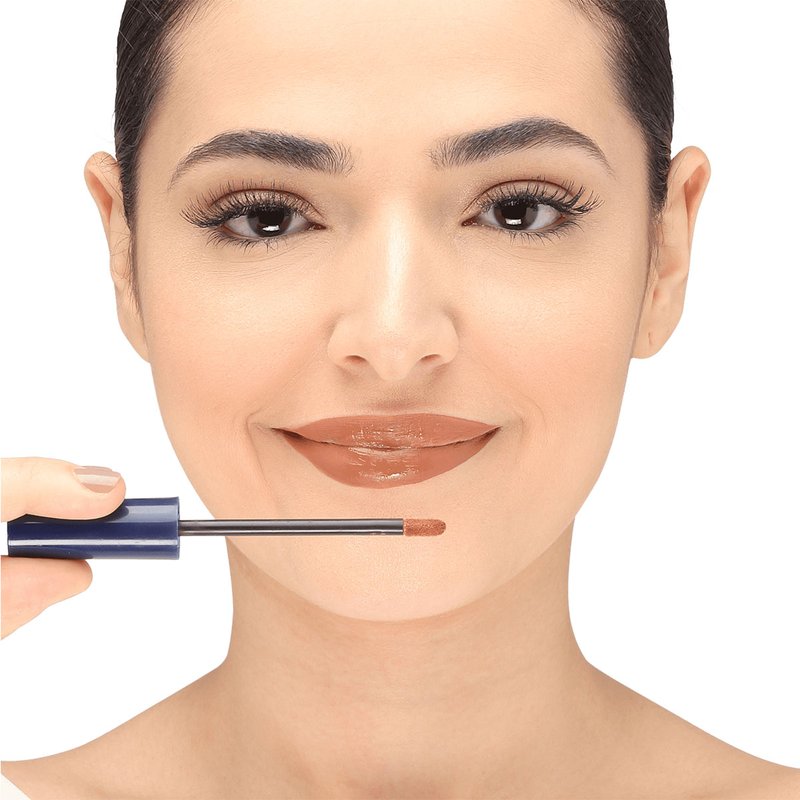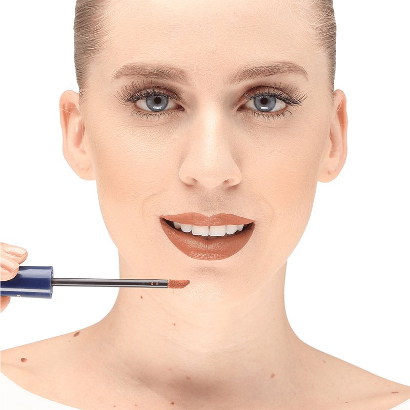 Aplique uma camada na parte superior e inferior dos lábios. Espere alguns segundos para a secagem do produto. Se necessário, aplique uma nova camada, retocando ou intensificando a cor até atingir o efeito desejado.