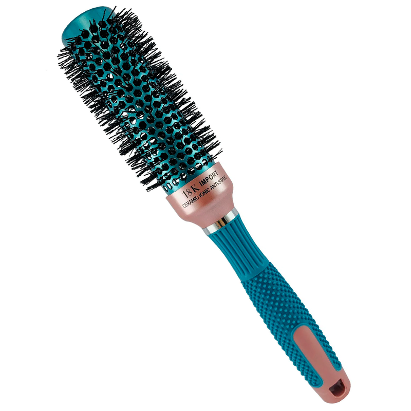 Escova térmica em cerâmica, com cerdas onduladas em nylon ionizada e cabo anatômico, antideslizante. As cerdas onduladas aumentam a superficie de contato das cerdas com os cabelos, o que facilita a penetração do fio, tornando a escovação mais eficaz.