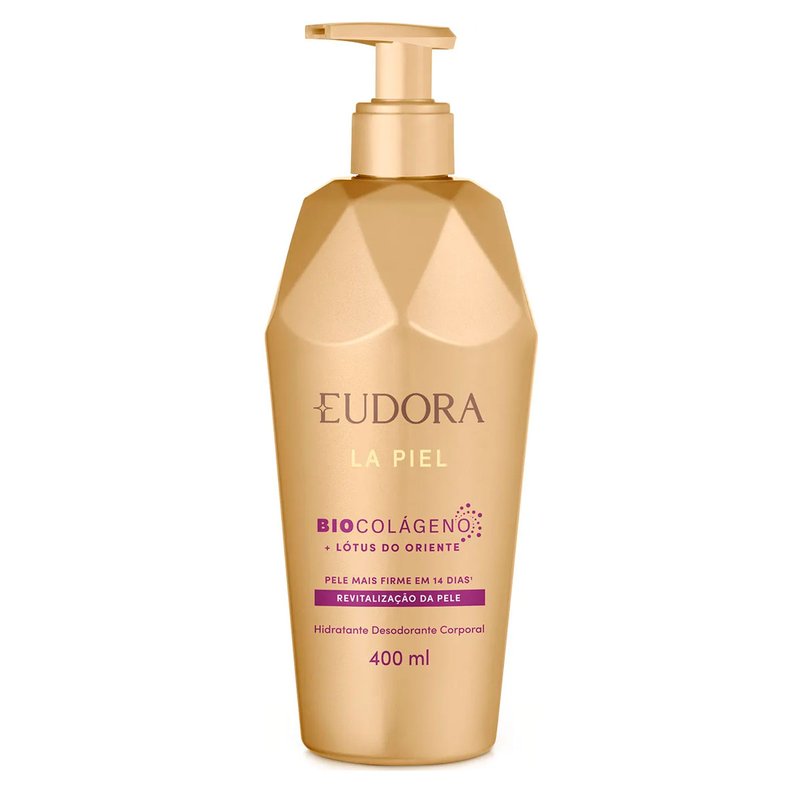 O Hidratante Desodorante Corporal La Piel Revitalização da Pele Eudora 400mL revitaliza sua pele, devolvendo a jovialidade, a firmeza e a elasticidade. Sua fórmula contém a união do Biocolágeno, Niacinamida e Pantenol, que juntos, aumentam a produção de colágeno natural e garantem uma pele mais firme com apenas 14 dias de uso.