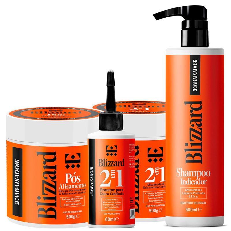 - Para Resultados de Alisamento - Deixe o produto agir por um período maior do que no relaxamento, também respeitanto o tipo de fio do cabelo que vai receber o procedimento, enxágue totalmente o cabelo, e utilize o Shampoo Indicador Blizzard Embaixador, para certificar que não há resíduos nos fios, aplique a Máscara de Hidratação Pós Relaxamento Blizzard Embaixador, enxágue para remover totalmente o produto e finalize com uma fonte de calor extrema.