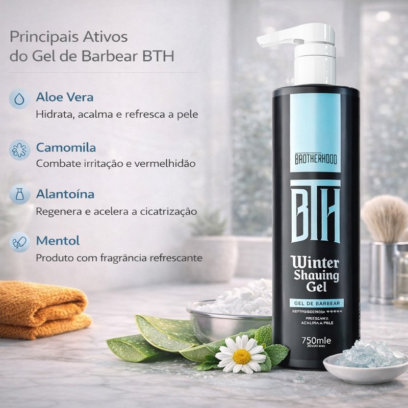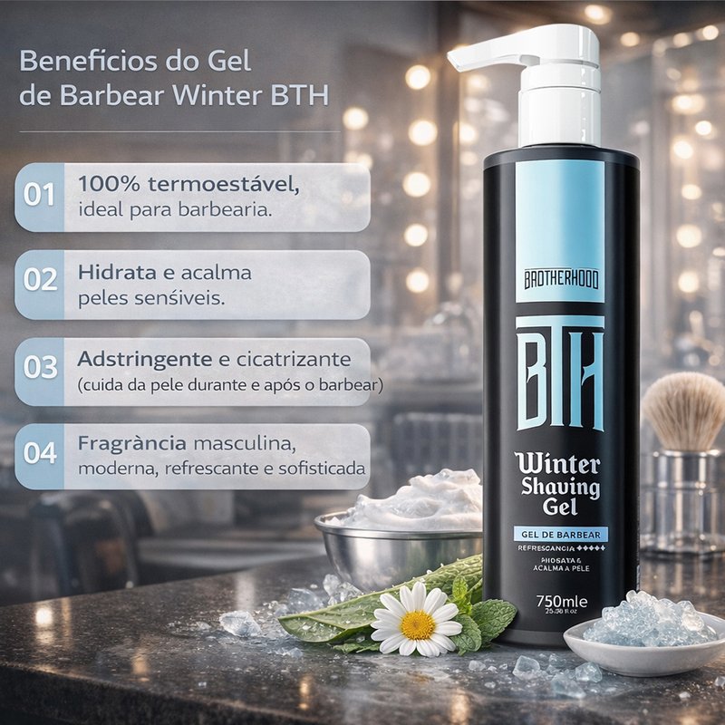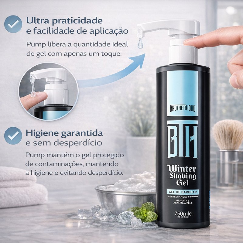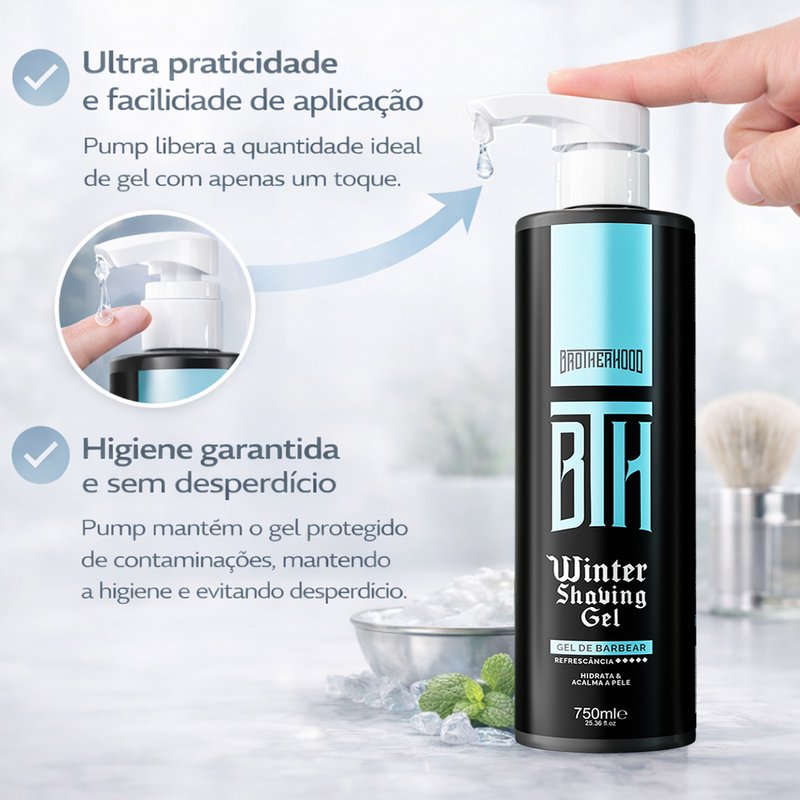 O Shaving Gel de Barbear Winter BTH (Pump Profissional de Alta Vazão) 750ml foi desenvolvido para barbearias e para o homem que busca um barbear preciso, confortável e sem irritação. Sua aplicação é rápida e descomplicada, potencializada pelo pump de alta vazão, que libera a quantidade ideal de produto com mais agilidade, criando um filme uniforme que proporciona deslizamento superior da lâmina e visualização clara do traçado, garantindo mais controle e precisão durante o barbear.