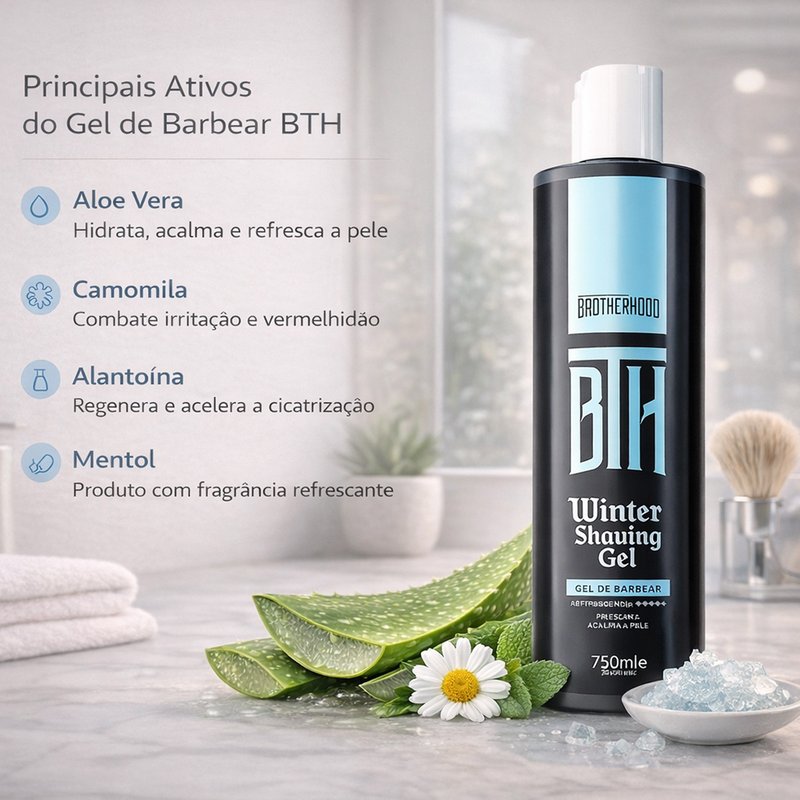 O Shaving Gel BTH Winter apresenta fragrância masculina refrescante com bulbo, proporcionando sensação imediata de frescor e leve efeito gelado na pele, ideal para uma experiência revigorante durante e após o barbear.
