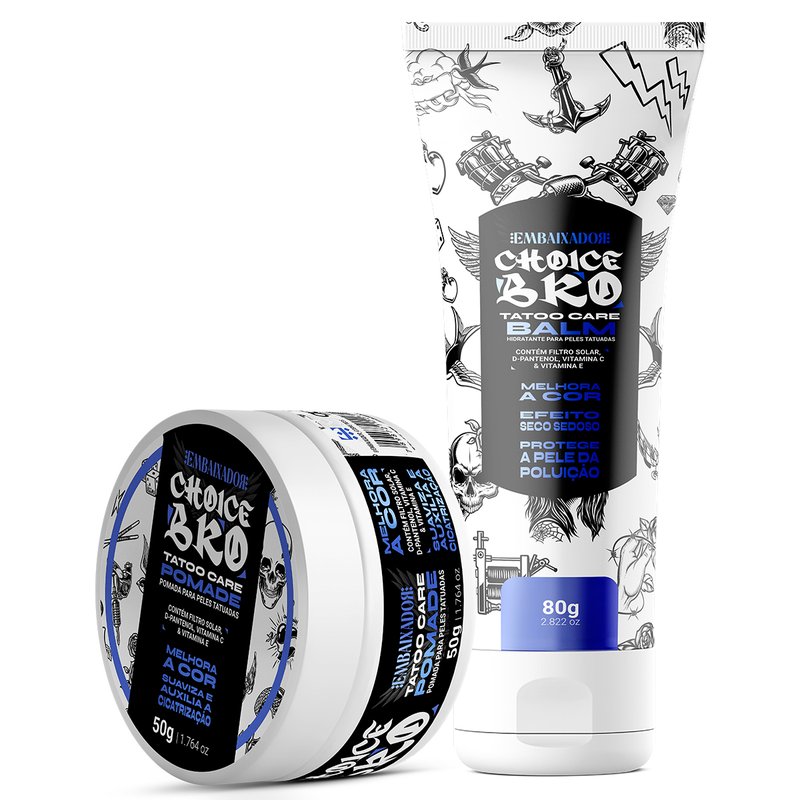A linha CHOICE BRO, foi especialmente formulada para garantir um cuidado completo e especializado para peles tatuadas. Mantendo tatuagens com cores vibrantes, pele hidratada e saudável.